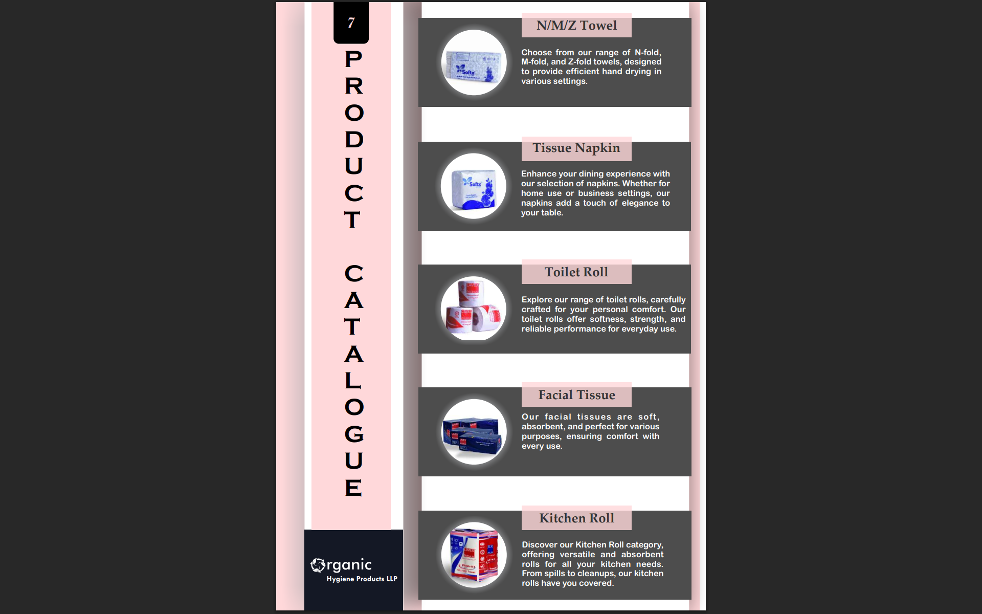 Organic Hygiene Products LLP is mainly a manufacturer, exporter and supplier of a variety of paper-based hygiene products. Its portfolio includes products typically used for personal and household hygiene, such as: