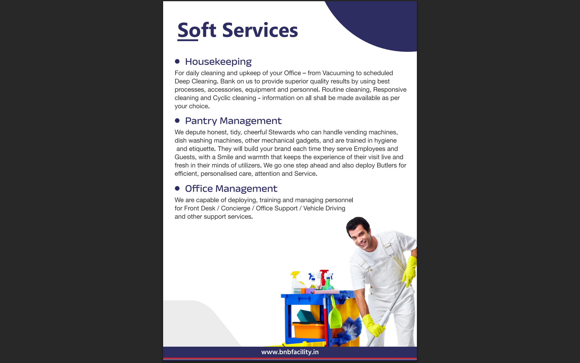 BNB Facility Management is your one-stop partner for all facility-related needs from cleaning and maintenance to workforce and property-management. We bring together a team of experienced professionals to ensure your premises remain safe, clean, functional and well-managed at all times.