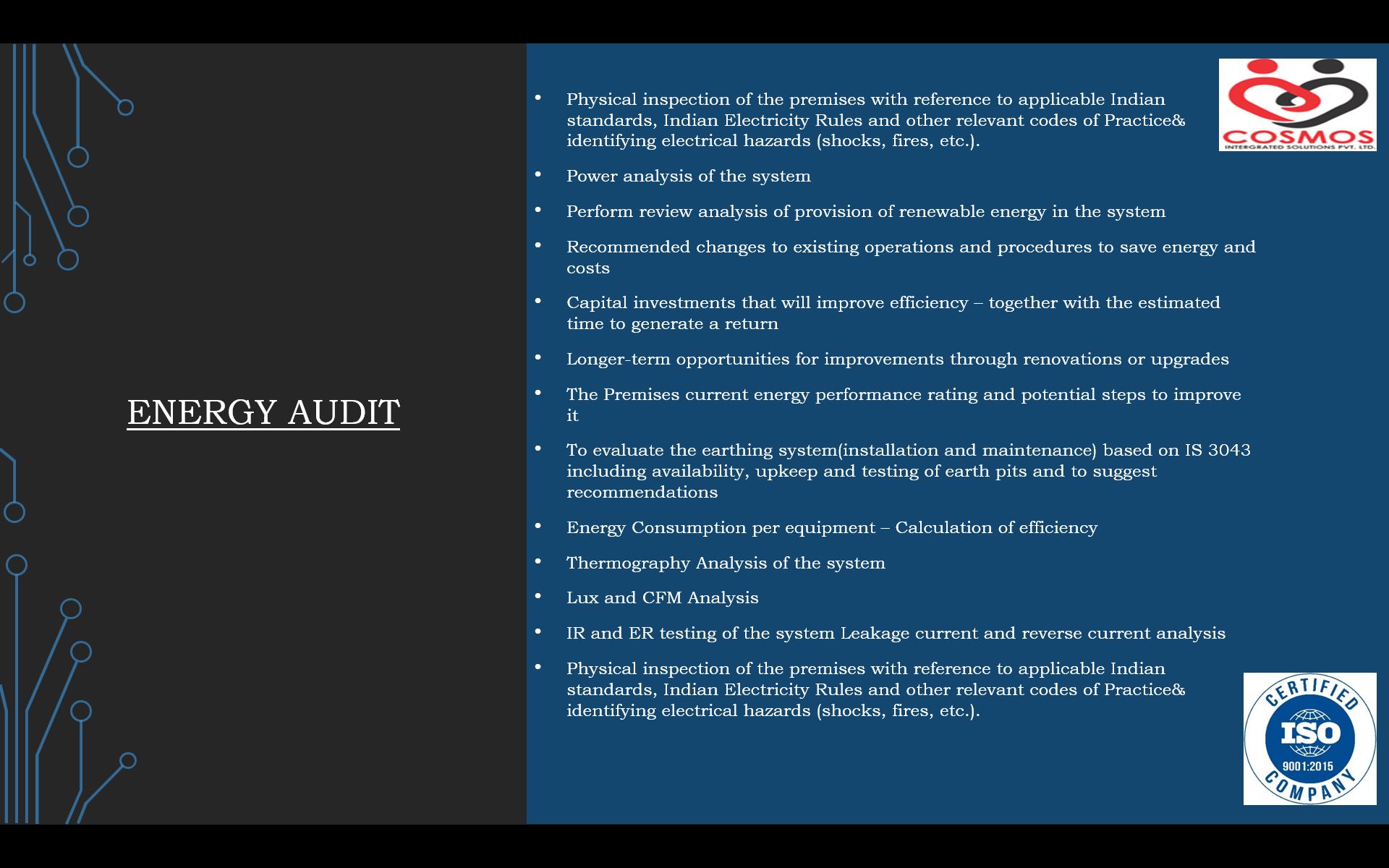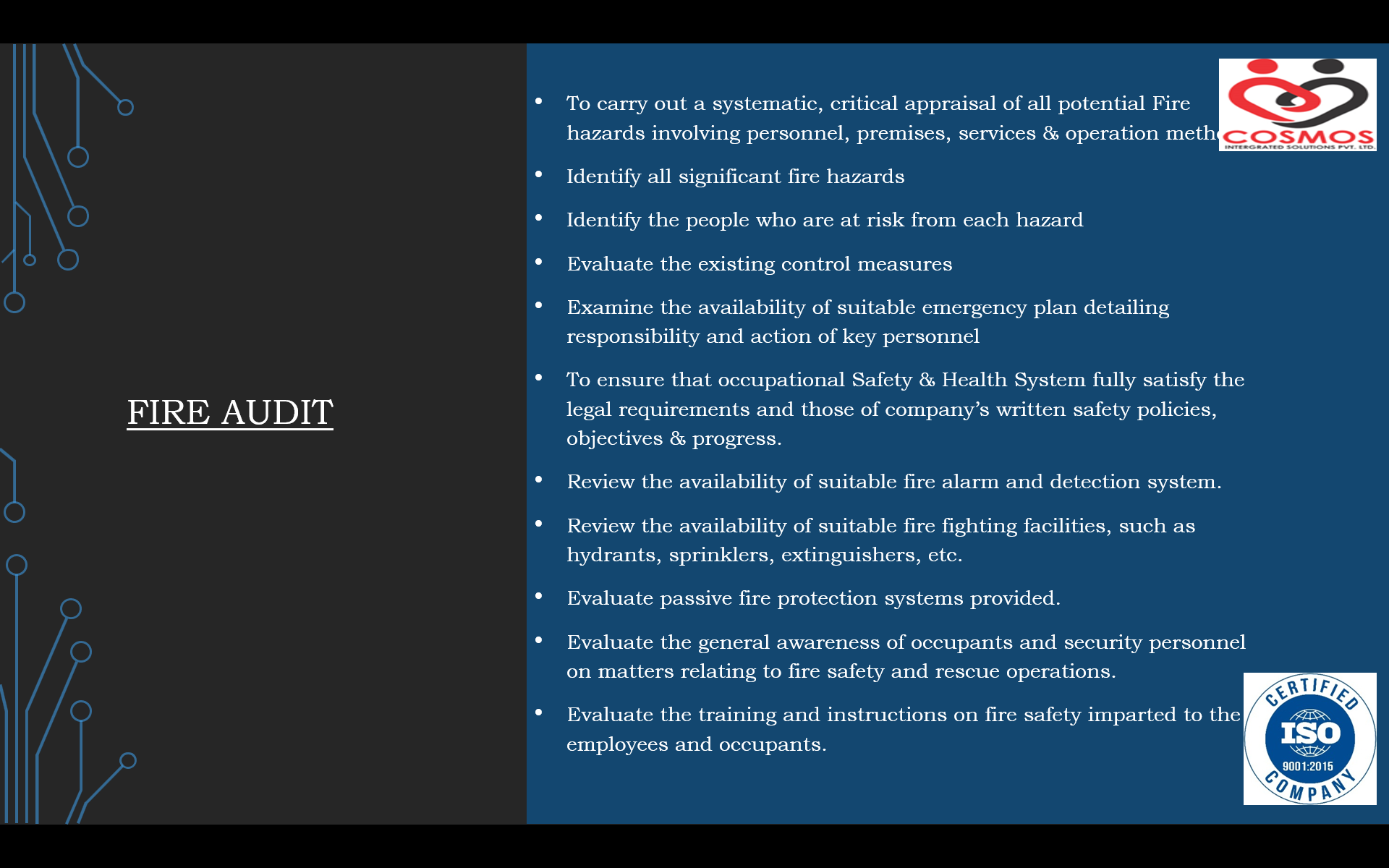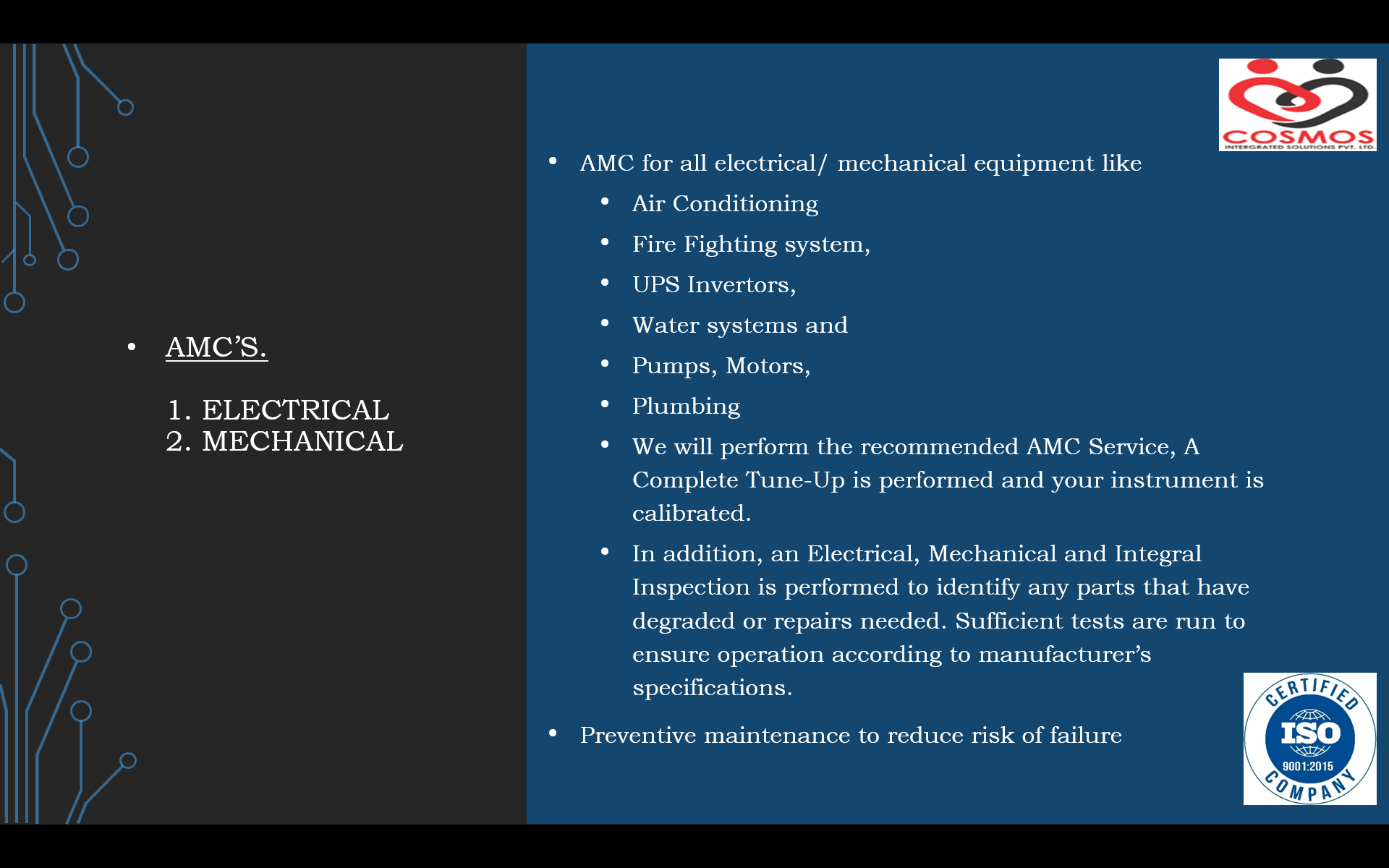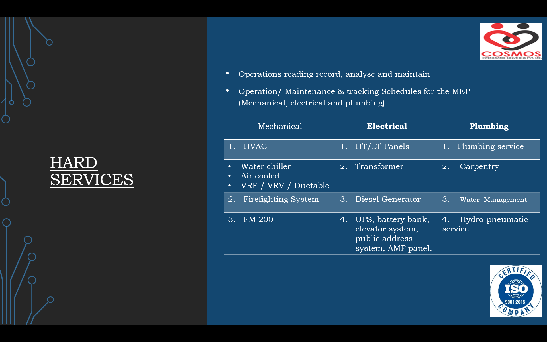 .... Read MoreWe would like to introduce our Company Cosmos Integrated Solutions Private Limited that has been founded by group of accomplished executives and entrepreneurs having decades of experience in Integrated Facility Management Services, Integration of Technology Products in Building Automations, Consulting and HR. Mr. Jaiprakash H Vaishya (JP) is the Founder & Director of Cosmos Integrated Solutions Private Limited and his association with the real estate Industry began with 2000, with him being instrumental in complete Executions of multiple sites of Building Automation Projects and Integrated Facility Management Services. We are specialised in M & E operation of Fire Alarm System, Public Address System, Access, CCTV, Water Leak Detection Systems, Rodent Repellent System, FM 200, BMS System, HVAC, Electrical Systems (Main LT Panels, HT Panels, AMF Panel, Transformer, Diesel Generator, Battery Bank, UPS, SMPS……….), STP, WTP, Fire fighting System, and Ancillary Services (Plumbing, Carpentry & Painting Services) as per requirement, Training & Third party Payroll Managements. We also do Integrated Building Management Systems Services from Consultancy, Design & Engineering, Supply, Installation, and Commissioning & Training. The above all Services has been provided to Government Organisation, Corporate clients.