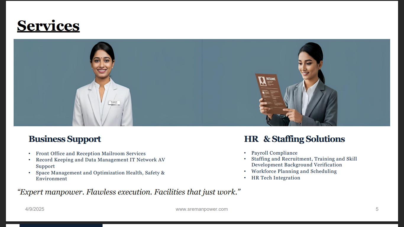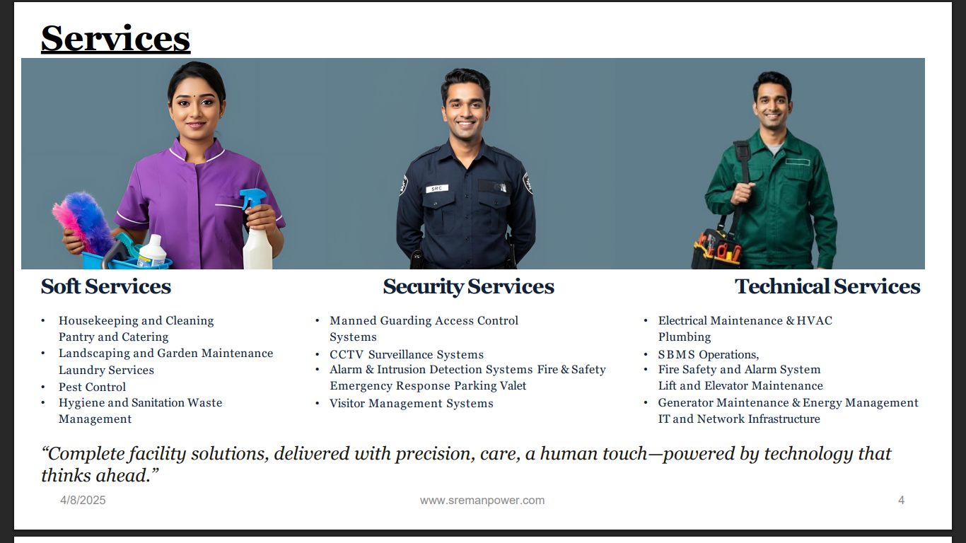 .... Read MoreAbout SRE Established in 1995, Shree Ram Enterprises (SRE) provides professional facility management services backed by skilled manpower and tech-enabled solutions. Our mission is to empower progress through people, processes, and performance.