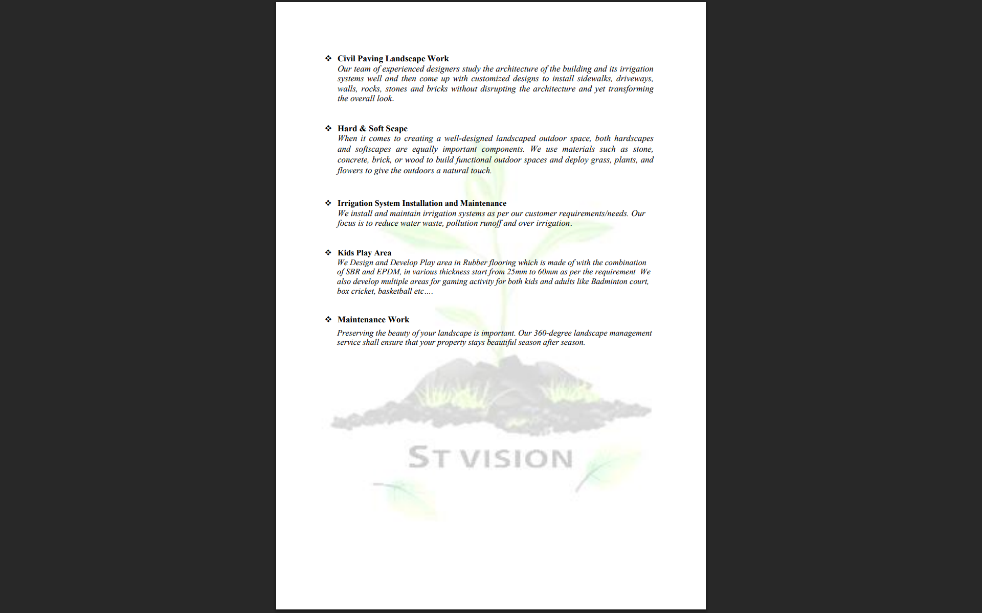 Welcome to ST Vision was Formed in the year 2013, our business activities are the Turn key solution for Landscaping, and also in Design & Development of garden and Irrigation work, Supply and maintenance of Indoor and Outdoor gardens and Irrigation Systems.