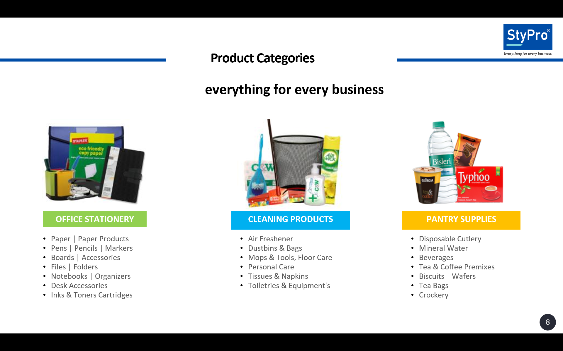 The company was formed with the intention of simplifying workplace procurement by acting as a single trusted supplier for various office, cleaning, and hygiene needs, helping organizations avoid dealing with multiple vendors. Its offerings span products such as office supplies, cleaning products, office furniture, pantry supplies, industrial supplies, lighting solutions, and facility automation items.