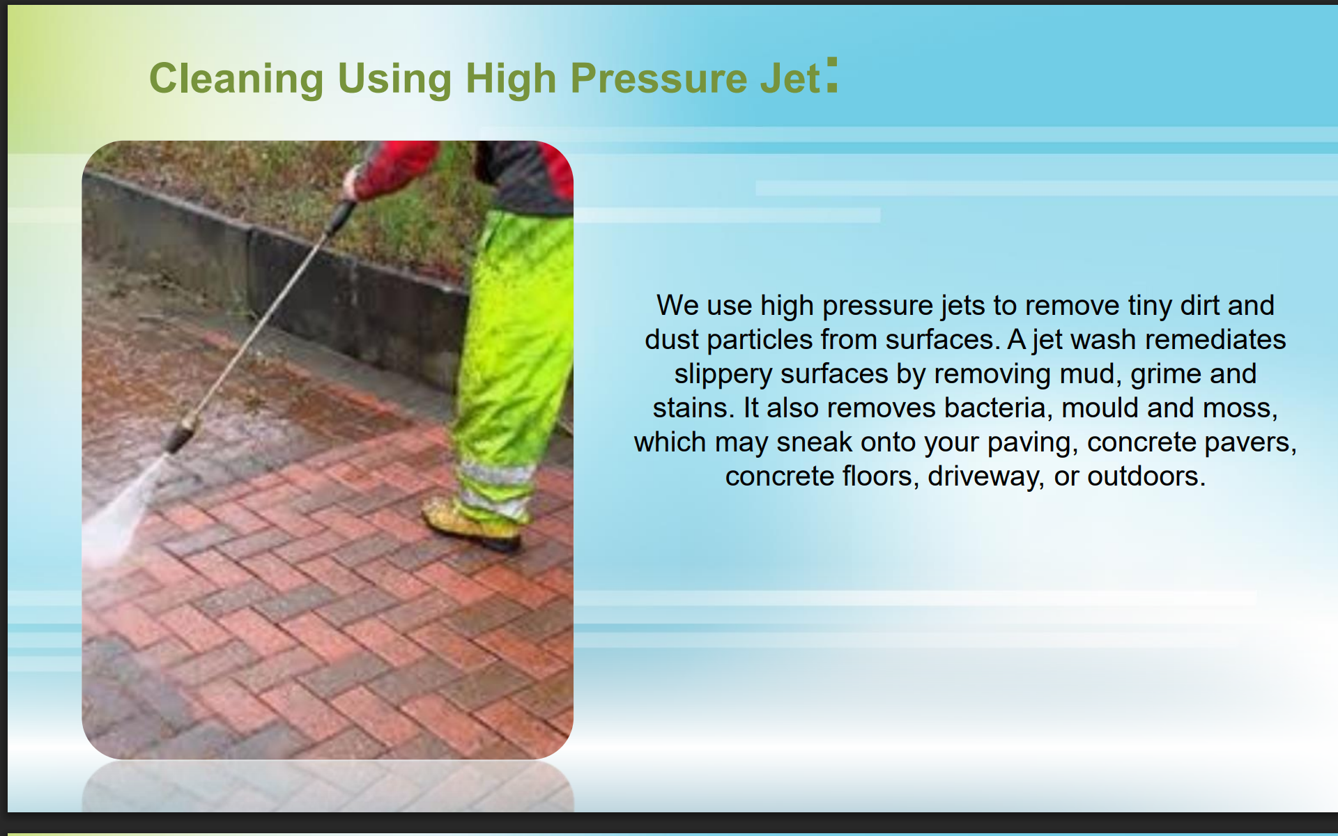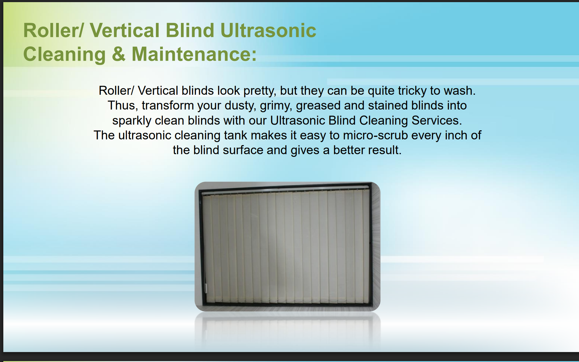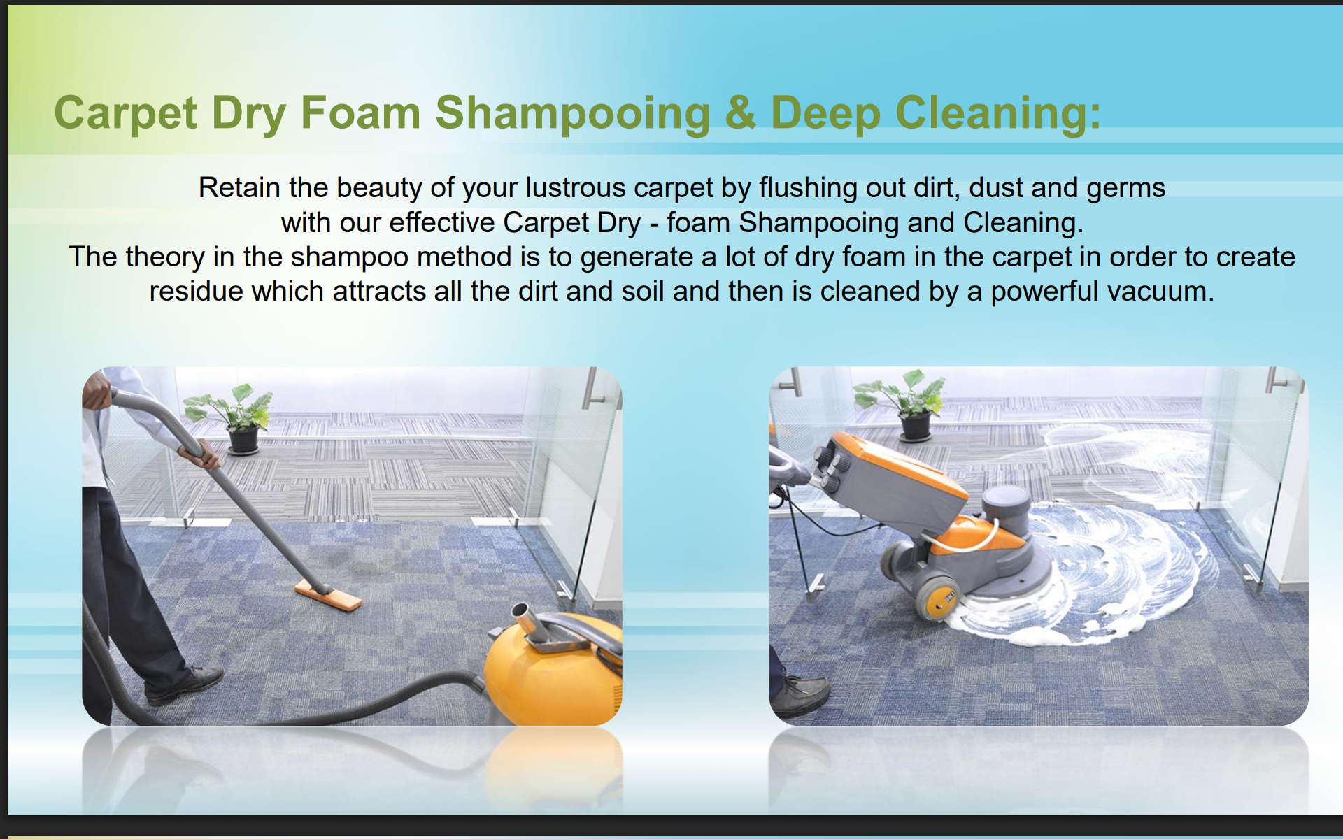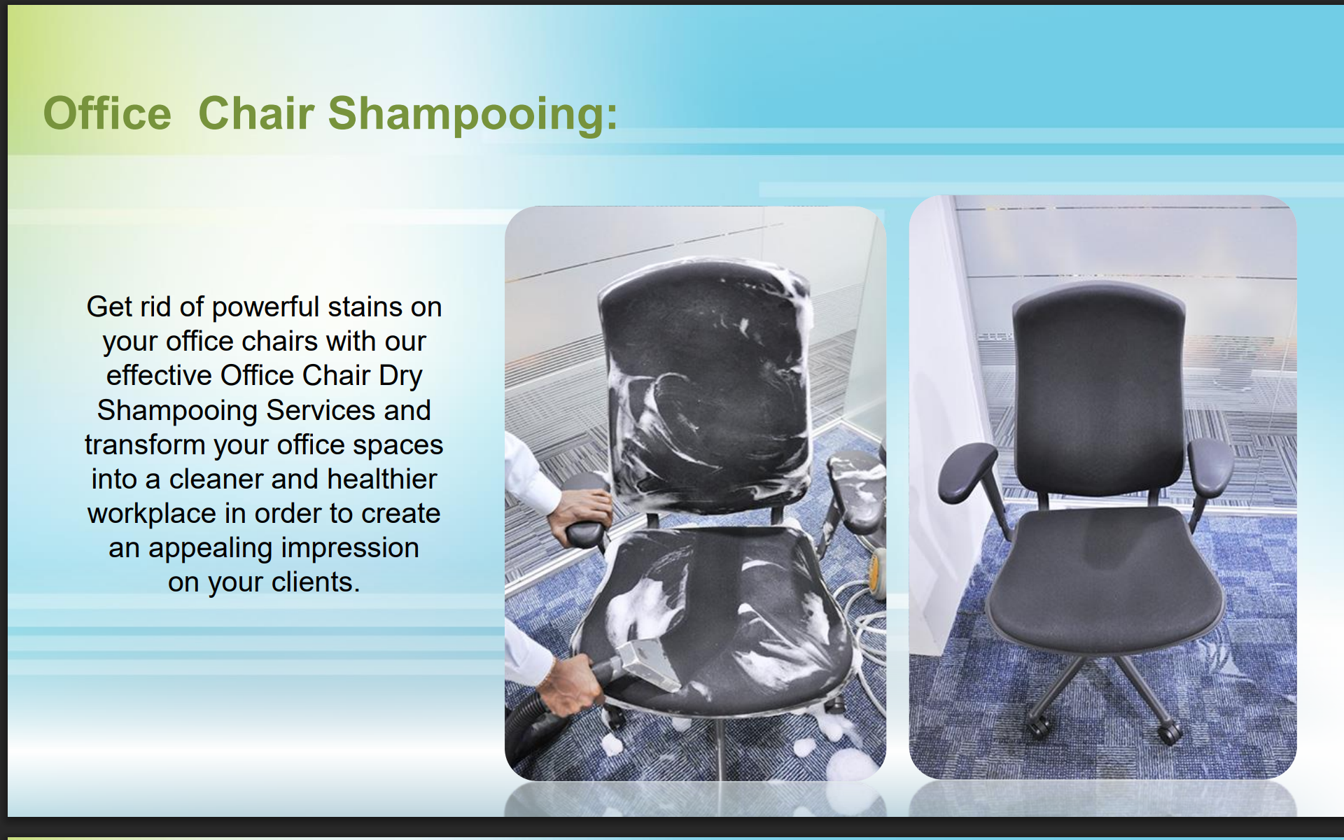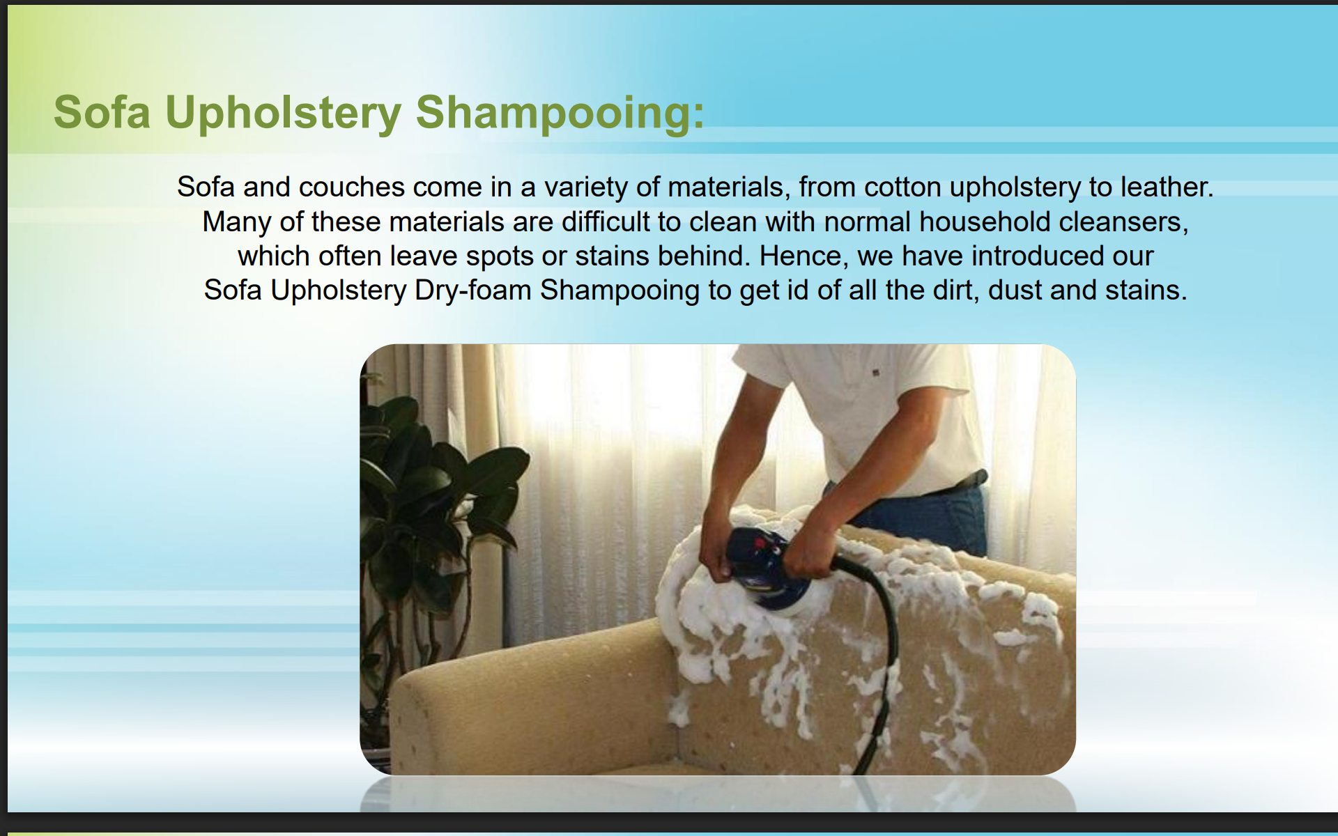 Our holistic cleaning treatments enable our clients to enjoy better air quality in their surroundings. We strive for client satisfaction by delivering the best possible experience with our quick, courteous and transparent service, attention to detail and use of technologically advanced mechanized cleaning equipments.