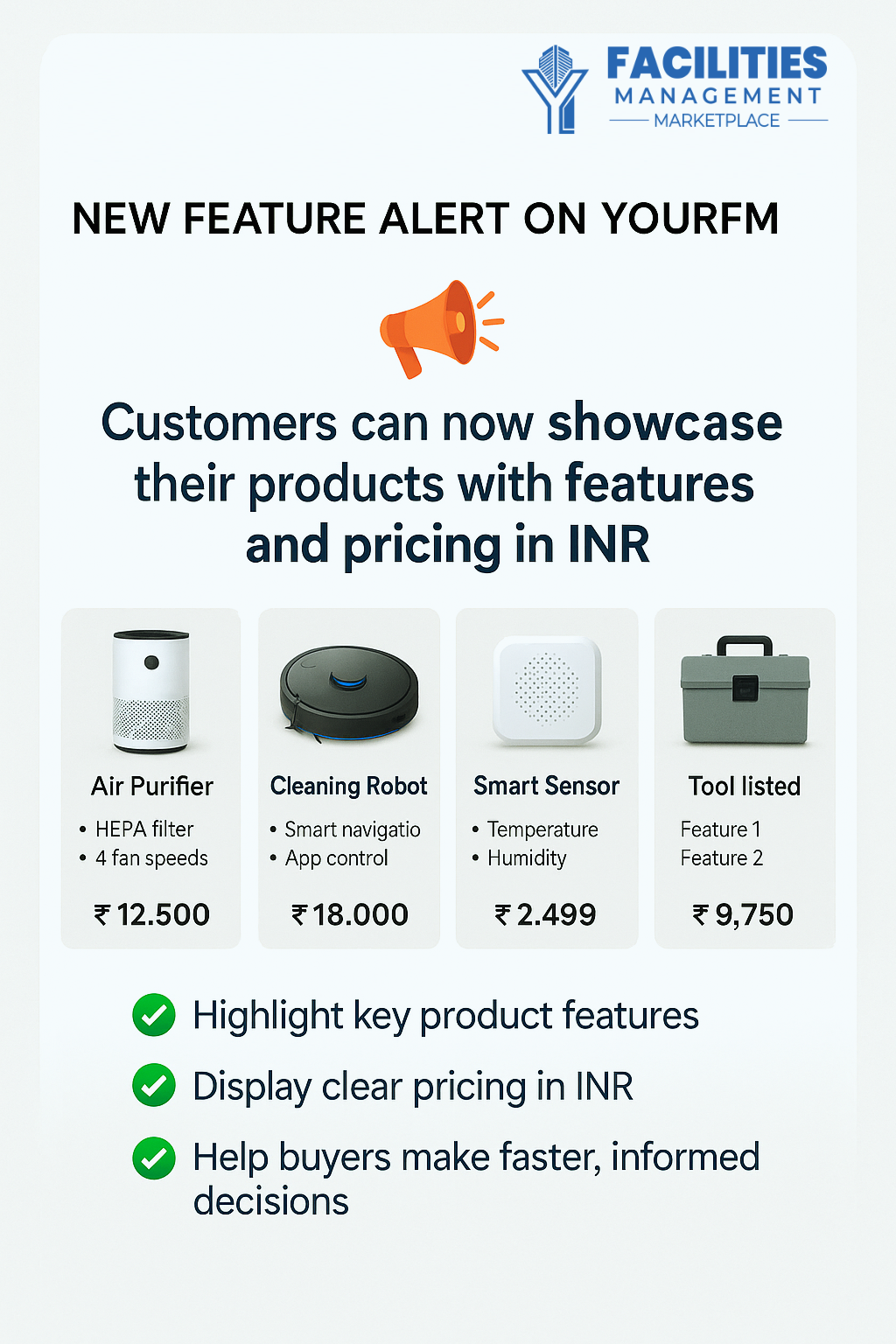 Whether you are offering air purifiers, cleaning robots smart sensors or other FM tools, this update makes it easier than ever to: